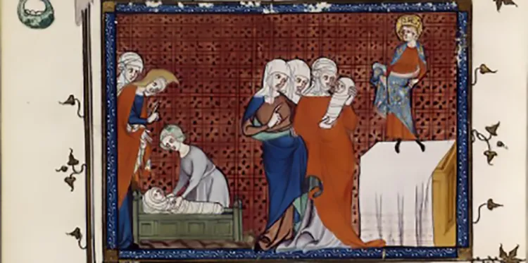 Medieval illustration of one of the miracles attributed to the French king Louis IX, from The Life and Miracles of St. Louis
