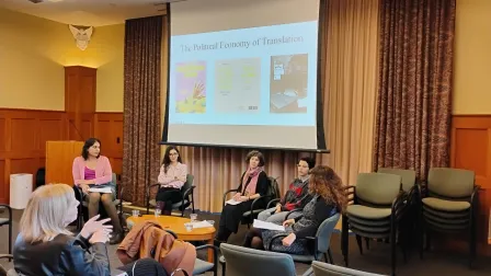 This piece commemorates the panel discussion “The Political Economy of Translation,” organized by the Global Comparative Humanities Working Group, which took place on February 4, 2026, at WashU. The panel featured translators AJ Javaheri (Farsi), Mona Kareem (Arabic) and Ena Selimović (Bosnian, Croatian, Montenegrin, Serbian). The discussion was moderated by Comparative Literature and Thought graduate student Safa Khatib and Anca Parvulescu, the Liselotte Dieckmann Professor in Comparative Literature.
