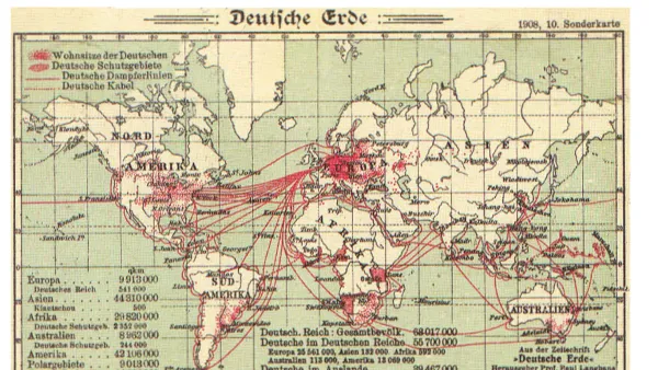 Headline image: The map “Deutsche Erde” (German earth) illustrates routes related to emigration and colonization and, Lynne Tatlock says, suggests the bigger world that at least some Germans might have been thinking about during the 19th and early 20th centuries.